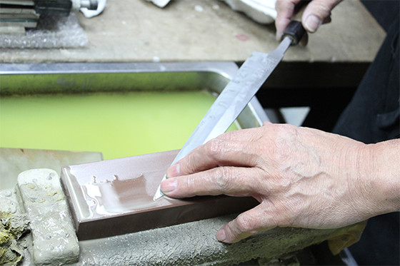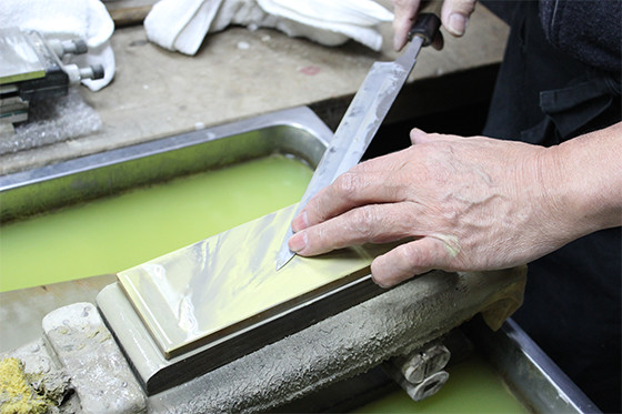 *While small amounts of water are occasionally added during sharpening, as the blade is sharpened by the grain of the whetstone, avoid washing away the sharpening sludge except when using the finishing whetstone.
