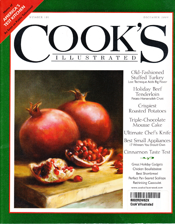 COOK'S ILLUSTRATED マガジン(ボストン・コモンプレス社)は、2カ月毎に発行されているアメリカの料理雑誌です。 この雑誌は料理用品・台所用品・食物・成分などについて、徹底的な評価が行われています。 正本総本店の包丁(MASAMOTO ハイパーモリブデン鋼 牛刀210㎜)は、カッティング・デザインともに3つ星の最高評価で№1になりました。